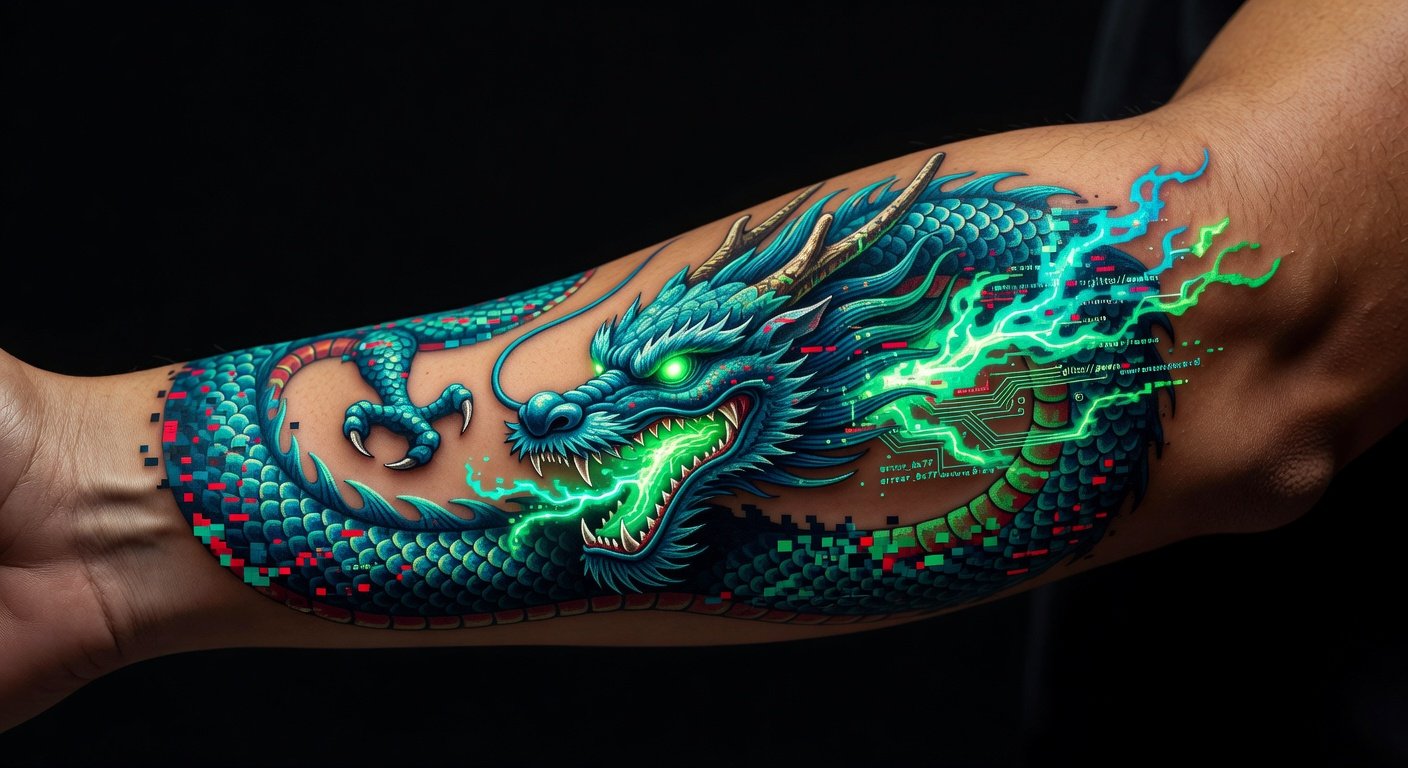 Chinese dragon longevity gets pixelated scales and LED eyes—power in digital age. Historical: Imperial strength. Visual: Neon green-black coils wrapping arm, dotwork flames. Post Malone's dragon vibes amplified. Personalize: Code snippets in scales for gamer bios.