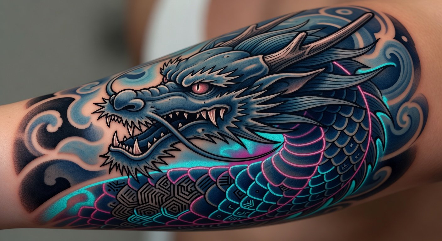 In 2026, neo-irezumi thrives, blending tradition with contemporary flair. Artisans like Horiyoshi III's successors use electric needles for precision while mimicking tebori textures. Neo-traditional styles shrink dragons for sleeves or thighs, incorporating surrealism—think dragons with cyberpunk neon accents or biomechanical armor.