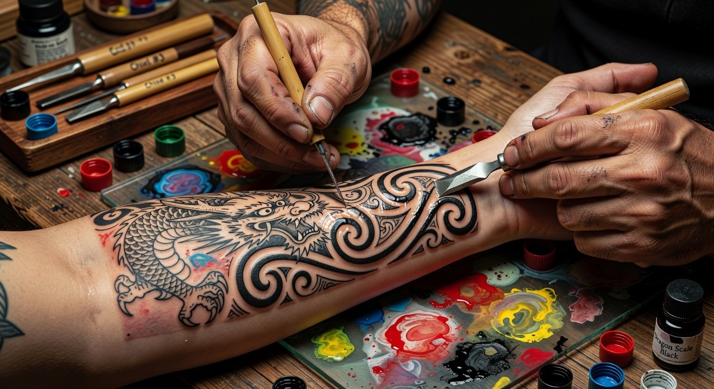 Japanese tebori ('hand-poked') uses a bundle of silk-wrapped needles (tsubaki) tapped by a mallet (teki). Master horishi artists layer ink in sessions lasting hours, building color depth through subtle shading (bokashi). This labor-intensive method, sans electric machines, yields organic lines and suits taking years.