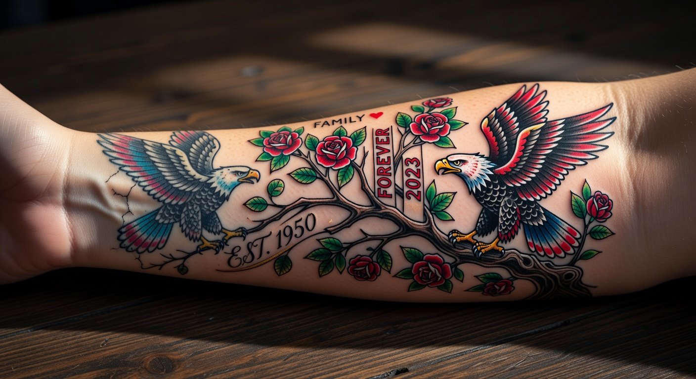 - The design evolved into a majestic neo-traditional eagle perched on a family tree branch, with roots bearing her grandparents' birthdates.