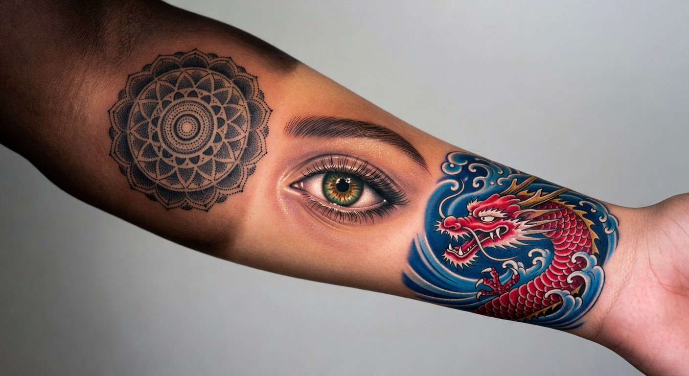 Real examples: A blackwork mandala armband vs. a realism wolf portrait on the chest. Fusion idea: Realistic koi in blackwork waves for personalized heritage nods.